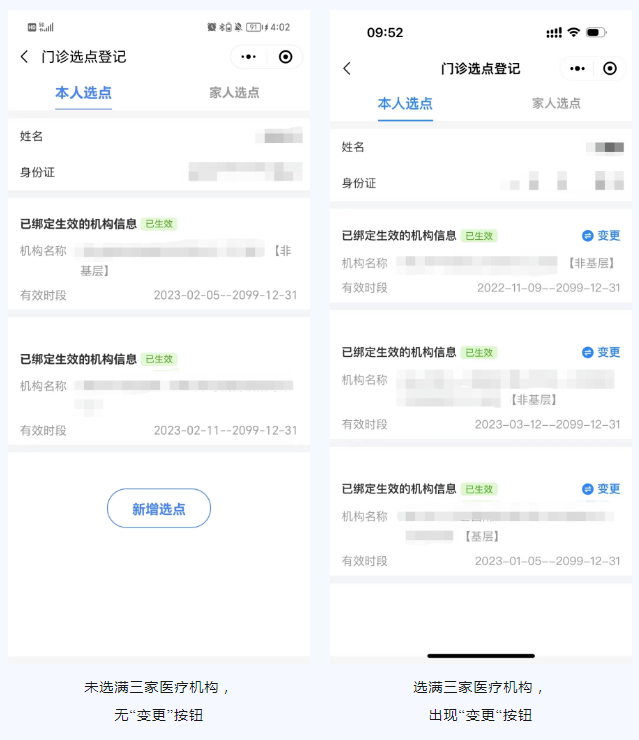 进入“粤医保”微信小程序,点击“门诊选点登记”,阅读办理须知后进入选点操作界面,如仅选了1或2家医院,则仍是“新增选定”按钮;如已选满3家,“变更”按钮出现,后按照选点流程操作即可。