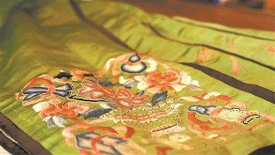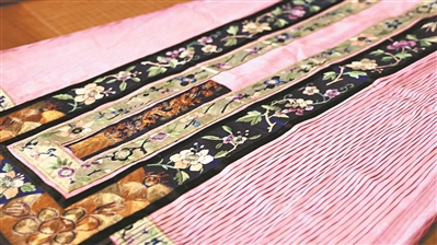 “传统马面裙上身搭配的是氅衣,长度通常会遮盖裙身上半部分,因此贵重工艺会展示在裙脚处。”林栖展示了一条通过拍卖所得的藏品马面裙,裙身烙印的是手工极其精良的粤绣绣花。“它的织带、如意纹等,表达的是蝶恋花花型,还有另一条手工制作的粉色鱼鳞百褶裙,它的保留度特别完整,上面的盘金绣层次很丰富……”
