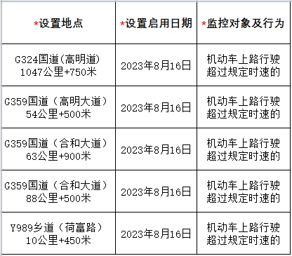 根据《中华人民共和国行政处罚法》第四十一条、《道路交通安全违法行为处理程序规定》第十六条的相关规定,现对5套电子移动测速设备设置地点信息进行公示,2023年8月1日至2023年8月15日为公示宣传教育期,请广大交通参与者严格遵守道路交通法律法规,文明驾驶,安全出行,共同营造安全、有序、畅通的道路交通环境。具体公示内容见附件,广东省行政执法信息公示平台“电子技术监控设备设置点”专栏中将同步公示内容。