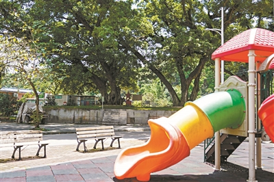 联丰村的古榕树旁修建了长椅、乒乓球桌、儿童滑梯等娱乐设施,供村民使用。