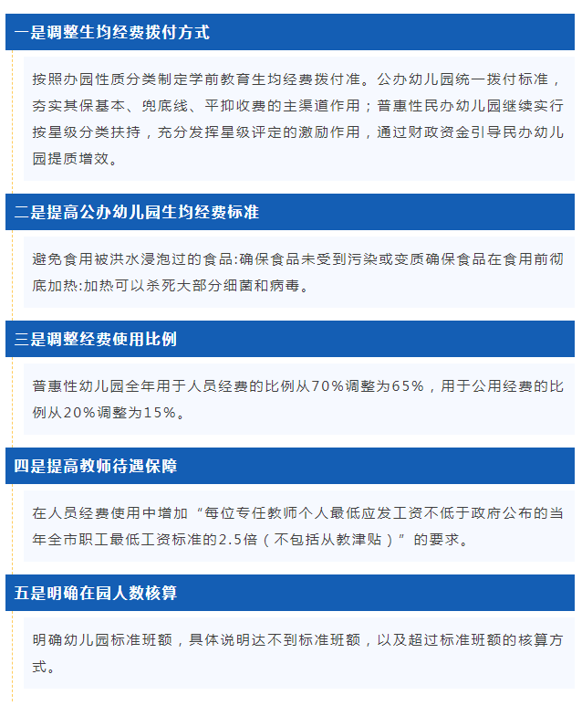普惠性民办幼儿园每位专任教师个人最低应发工资,从不低于政府公布的当年全市职工最低工资标准的2倍,提高到2.5倍。增加设立教师队伍建设专项资金要求,从保教费收入中提取不低于5%的比例,用于教职工职业激励或增加待遇保障。