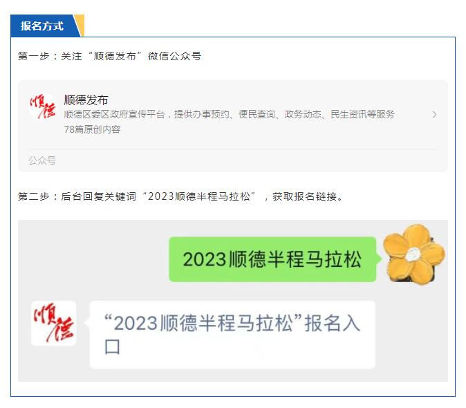 1.个人报名可通过美的·2023顺德半程马拉松公众号“顺德发布”“顺德半程马拉松”“RUN润跑”进入报名系统进行报名,每位报名者只能在半程马拉松、欢乐跑中选择一项进行报名,不接受团体报名。