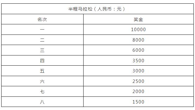 半程马拉松公开组男、女前八名以枪声成绩进行排名。奖金需缴纳20%的个人所得税,由组委会代收代缴,具体奖金如下表: