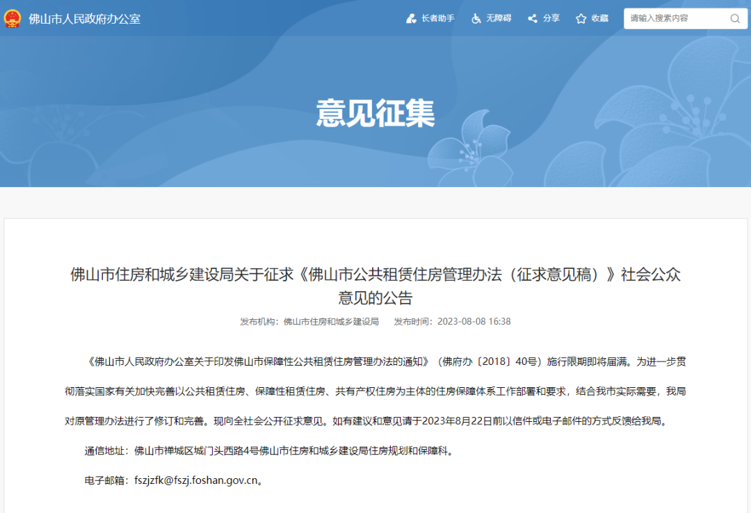 目前,《佛山市保障性住房管理办法》有效期即将届满,根据规范性文件清理工作要求,以及佛山市住房保障工作的实际需要,佛山市住房和城乡建设局对该办法进行修订,形成《佛山市公共租赁住房管理办法(征求意见稿)》,以完善住房保障相关管理制度。