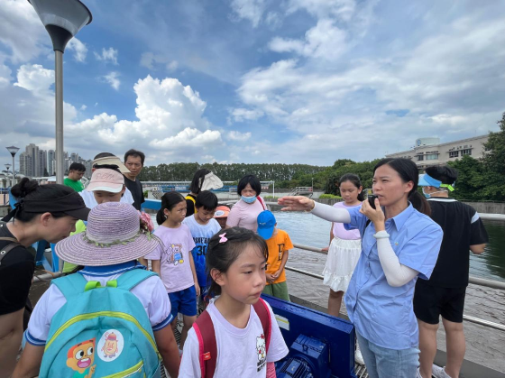 (图:亲子家庭在西朗污水处理厂参观多个污水处理工序,认真听工作人员的详细讲解)