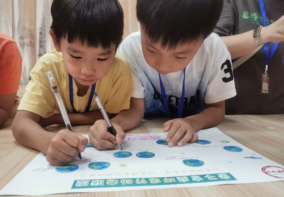 (图:通过环保学习孩子们十分认真的写下通过环保保护地球的心愿)