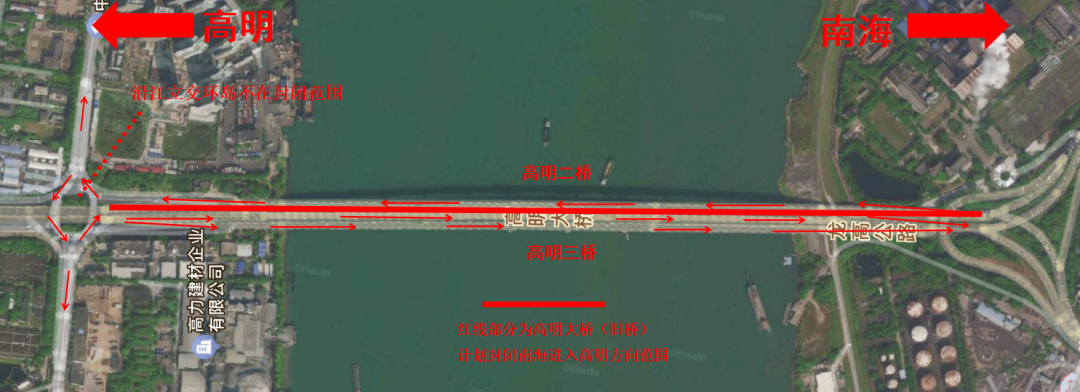 △此图为高明大桥(旧桥)封闭南海进入高明方向车道,从南海进入高明方向需走高明三桥,高明大桥(旧桥)往南海方向通行不受影响正常行驶。