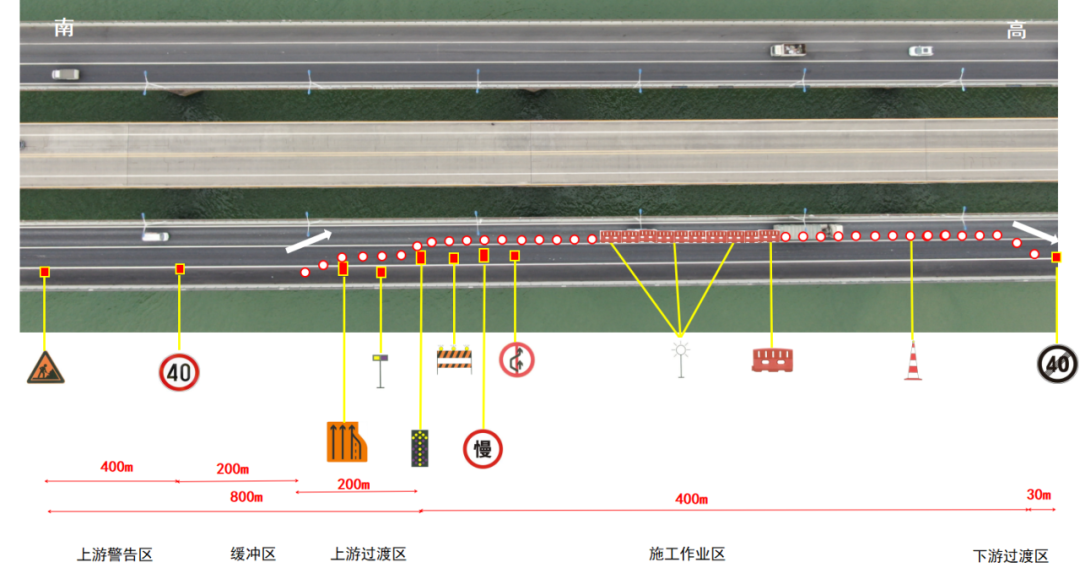 △交通组织示意图。高明二桥和高明三桥均为单向两车道,届时将临时占用高明二桥、高明三桥各一条车道进行施工作业,车辆可根据现场交通引导行驶通过高明二桥、高明三桥。