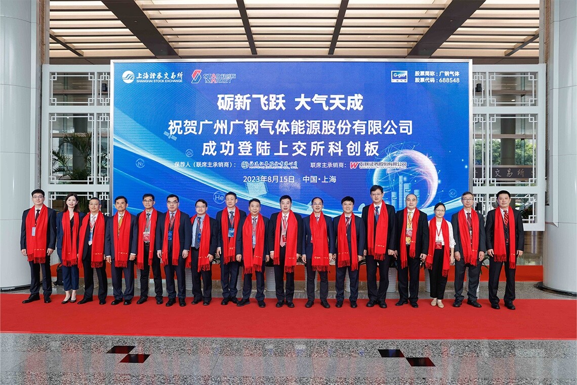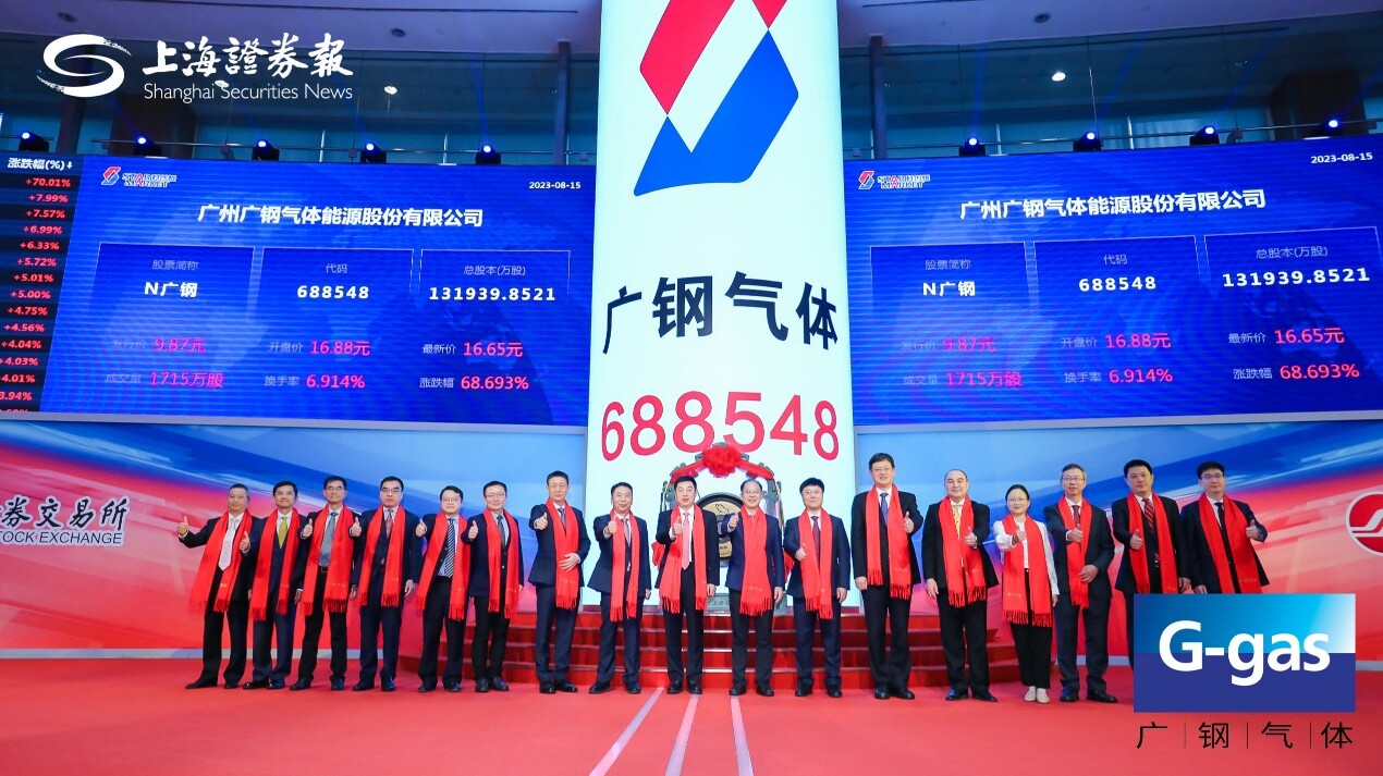 2023年8月15日,广州广钢气体能源股份有限公司在上海证券交易所科创板成功上市,证券简称“广钢气体”,证券代码688548.SH。公司本次公开发行股票3.30亿股,发行价格9.87元/股,募集资金总额约32.56亿元。广州市政府副秘书长高裕跃出席并宣读广州市人民政府上市贺信,市国资委主任陈德俊、市地方金融监管局副局长徐秀彬等出席上市仪式。