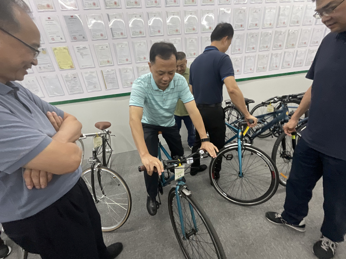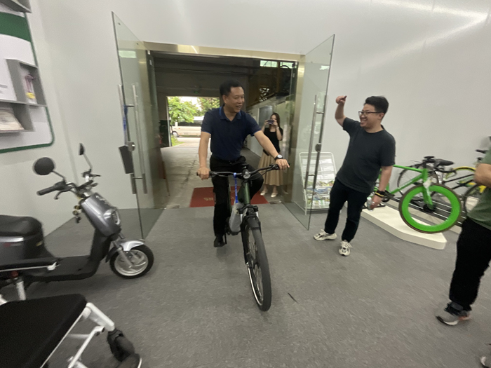 座谈之后,李激初邀请两市考察组人员到洛梵狄产品展厅参观。展厅摆满配有电子车锁和内变速器的各款新颖的自行车,引起宾客们的浓厚兴趣。洛梵狄工程技术人员热情为宾客解答疑惑问题。还请客人上车试骑,体验一下国产高档自行车的骑行感受。 (黄志海) 2023年8月22日