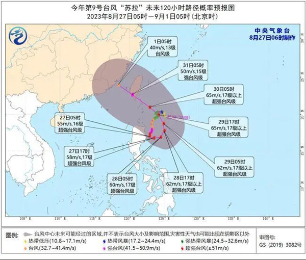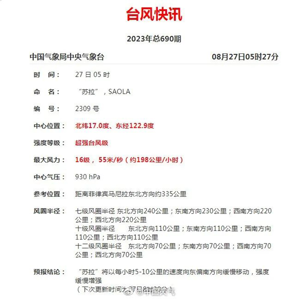据中国天气网,今年第9号台风“苏拉”已于8月26日夜间由强台风级加强为超强台风级,预计其将先在菲律宾吕宋岛东北部洋面徘徊,29日开始向西北方向移动,30日夜间掠过台湾岛南部,31日白天进入台湾海峡。