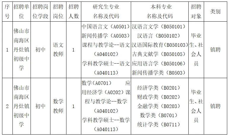 本场招聘临时聘用专任教师2名。详见《南海区丹灶镇丹灶镇初级中学2023-2024学年面向社会公开招聘临时聘用专任教师计划和岗位表》。