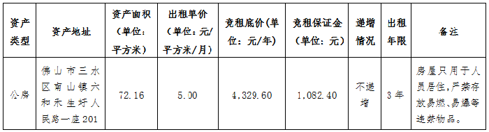 为充分盘活南山镇的公有资产及满足社会租赁需求,现我司定于2023年9月6日(星期三)上午9:30在佛山市三水区南山镇公共资源交易所(201室),对位于佛山市三水区南山镇六和禾生圩人民路一座201的公房进行公开竞租。根据《佛山市三水区南山镇国有企业“三重一大”实施制度》(南府发[2023]1号)的相关规定,现将有关事项公告如下: