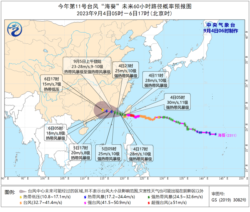中央气象台9月3日18时继续发布台风红色预警。台风“海葵”(HAIKUI)的中心已于昨天(9月3日)晚上7点50分前后移入台湾海峡南部海面,今天(9月4日)早晨5点钟进一步减弱为强热带风暴级。预计,“海葵”将以每小时10公里左右的速度向西偏北方向移动,逐渐向闽粤交界一带沿海靠近,并将于9月5日上午在福建漳浦至广东惠来一带沿海登陆(热带风暴级到强热带风暴级,23-28米/秒,9-10级),登陆后向偏西方向移动,强度逐渐减弱。