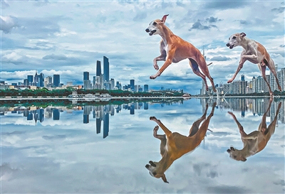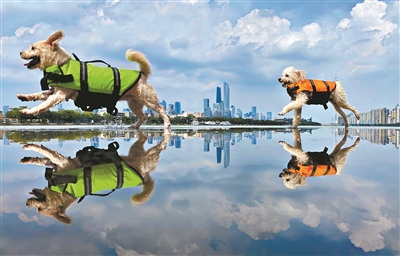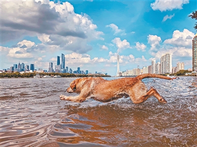 天蓝水碧,城市清新。平静无风的夏日,宽阔的珠水倒映蔚蓝天空,两只小犬凌空跃过,带起一阵水花。它们身姿矫健,活跃非凡,时而在水中遨游,时而在岸上奔跑,引得市民游客拍手叫好。
