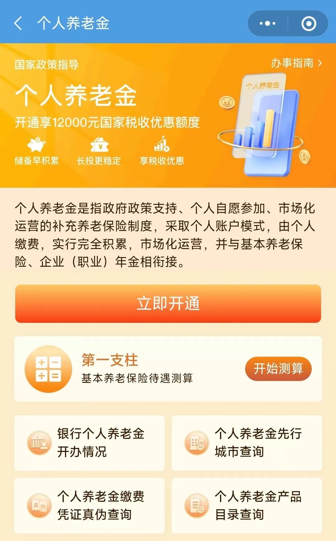 首次进入个人养老金服务时,通过点击【立即开通】按钮进入个人养老金账户开立服务。