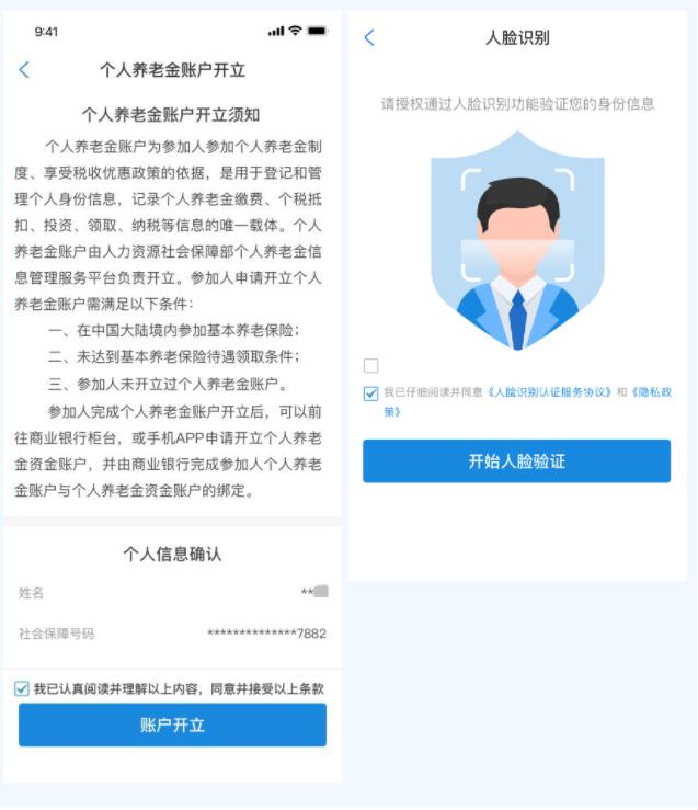 进入【账户开立】页面,阅读个人开户须知并完成个人信息确认,点击【账户开立】按钮,通过人脸识别认证后,即完成个人养老金账户开立。