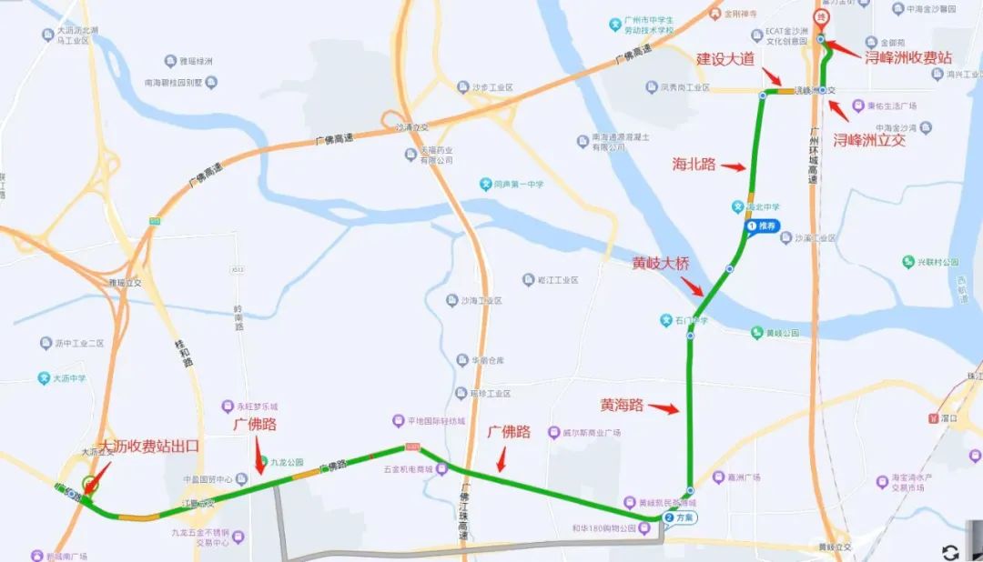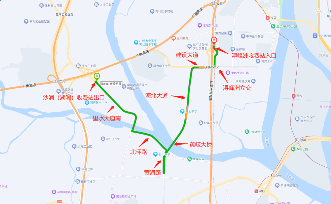 广佛高速大沥站出口→广佛路→黄海路→黄岐大桥→海北路→建设大道→浔峰洲立交→北环高速浔峰洲站入口→广州环城高速