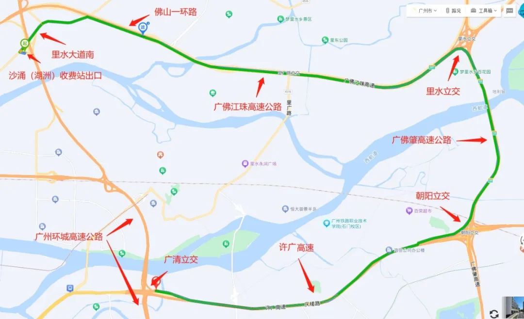 广佛高速沙涌站(往广州)出口→里水大道南→佛山一环路→广佛江珠高速→里水立交→广佛肇高速→朝阳立交→许广高速→广清立交→广州环城高速