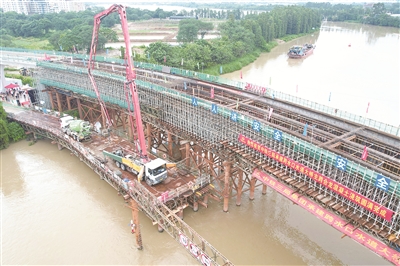 9月15日,南海区有轨电车里水示范段工程项目——跨水口水道大桥主跨顺利合龙。/佛山市新闻传媒中心记者梁家豪摄