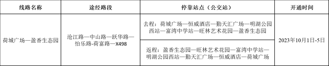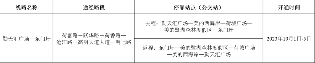 班次时间:2023年10月1日-5日发车,2班次/天,去程18:00勤天汇广场站发车;回程22:00东门圩发车,市民可免费乘坐。