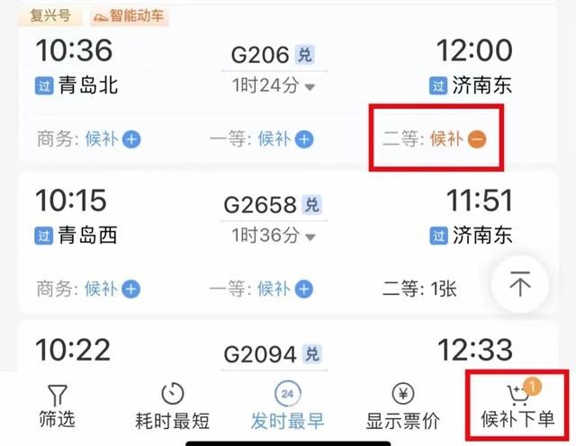 查询车次没有余票时,显示列表中会出现“候补”字样,可根据需求点击相应车次席别对应的“候补”区域,系统将加入当前候补购票需求列表。