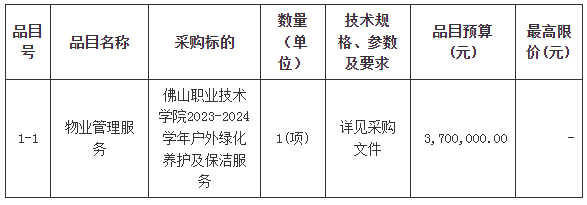 佛山职业技术学院2023-2024学年户外绿化养护及保洁服务招标项目的潜在投标人应在广东省政府采购网https://gdgpo.czt.gd.gov.cn/获取招标文件,并于 2023年10月08日 09时00分 (北京时间)前递交投标文件。