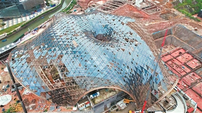 记者从广州金融城站综合交通枢纽公司获悉,目前,广州金融城广场工程主体结构已封顶,钢结构网盖以及玻璃幕墙接近完成,机电安装及装饰装修进入收尾阶段。“锦鲤馔玉”的外观造型已初现,项目总体进度完成90%,预计今年底完工。
