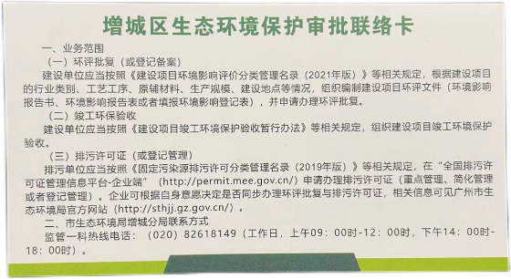2023年8月,习近平总书记在全国生态环境保护大会上强调,要正确处理高质量发展和高水平保护的关系。为进一步为增城高质量发展把好环境关、守好生态线,市生态环境局增城分局结合增城区中小企业数量众多、位置分散、所涉行业及工艺广泛的特点,设计制定“增城区生态环境保护审批联络卡”(后简称为“联络卡”),督促镇街工作人员指导工厂企业“一卡”读懂环保审批手续,为工厂企业提供更加规范便利的咨询服务。