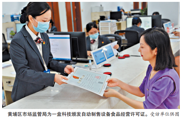 9月13日,黄埔区市场监管局将“新鲜出炉”的自动制售设备食品经营许可证递到广州一盒科技有限公司(下称“一盒科技”)总经理刘小姐的手中,标志着全省首批5台标准化全餐自动制售设备在黄埔“持证上岗”。