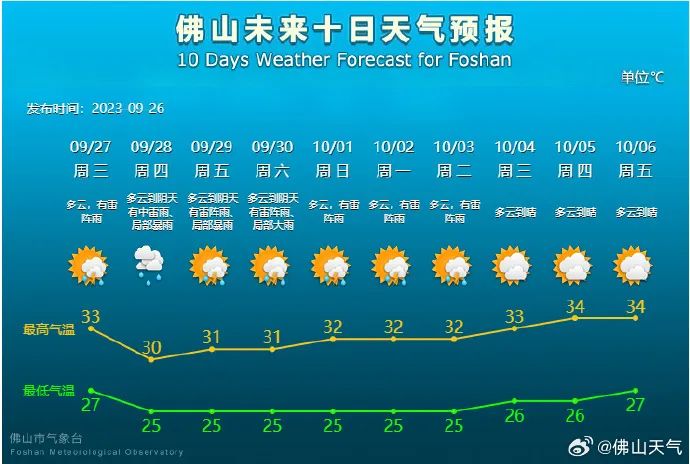 据佛山气象台预测,9月28-29日受弱冷空气和东风波动影响,佛山有中雷雨、局部暴雨,9月30日到10月3日仍有雷阵雨。