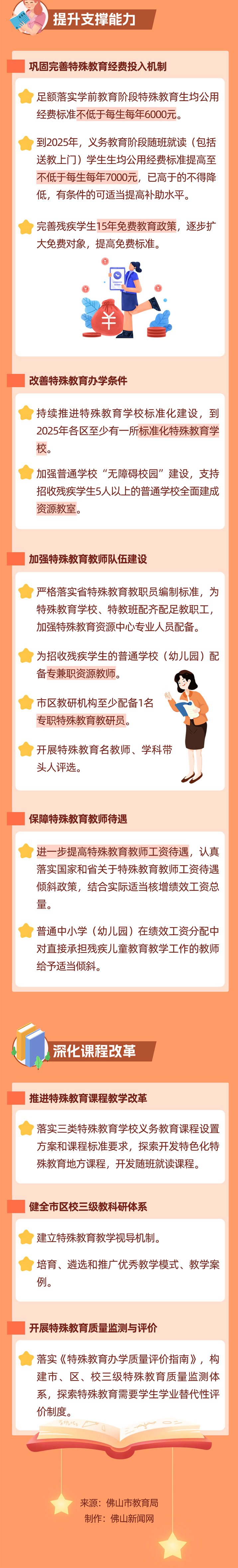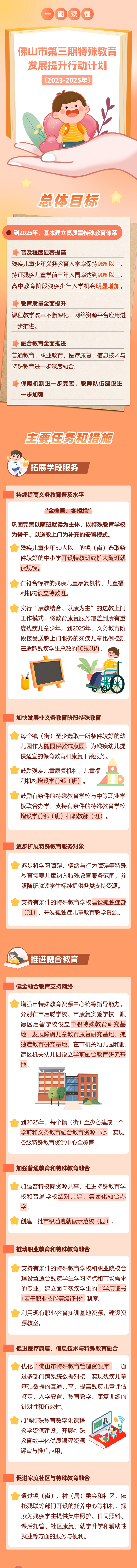近日,佛山市教育局等7部门联合印发《佛山市第三期特殊教育发展提升行动计划(2023-2025年)》(以下简称第三期提升计划),以拓展学段服务、推进融合教育、提升支撑能力、深化课程改革四个方面的任务措施,推动特殊教育高质量发展。