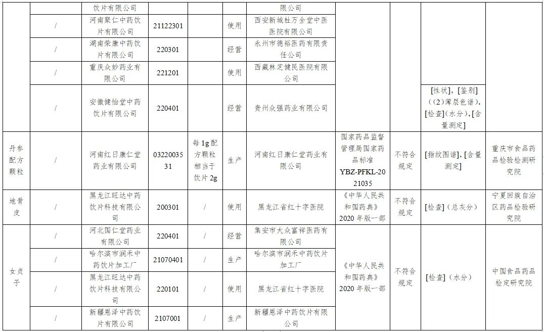 经中国食品药品检定研究院检验,标示为河北国仁堂药业有限公司、哈尔滨市润禾中药饮片加工厂、黑龙江旺达中药饮片科技有限公司、新疆恩泽中药饮片有限公司生产的4批次女贞子不符合规定,不符合规定项目为水分。