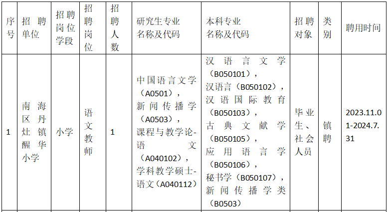 本科以上学历,具备小学语文(或以上)教师资格证,有相关工作经验者优先。薪酬按狮山镇有关临聘教师待遇文件执行。