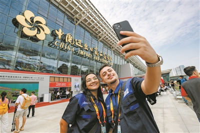 除了“文化魅力”,参展商还运用“科技引力”。在B区展馆,清洁消杀机器人、物流配送机器人在人流中穿行,吸引不少境外采购商驻足。这些机器人来自广州映博智能科技有限公司,该公司主要研发满足商用物业需求的服务型机器人。除了自己的展区,映博智能还“派”安保机器人在展馆各区域巡逻。该展区负责人介绍,今年的参展机器人增加了一款“带娃机器人”,主打儿童陪伴,可以和儿童对话,家长也可以通过机器人实现远程陪伴。