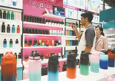 如何能让水杯更耐用?参展商的一点小改款就能实现。“一般水杯会在瓶身开合的位置使用机械式设计,使用时间一长,开口容易磨损,但用磁吸实现‘无接触卡位’,就能让水杯更耐用。”优之科技(深圳)有限公司品牌经理桑运超告诉记者。“这些改动虽小,但很受客商欢迎,本届广交会到展位人流量不错,感觉已经回到了2019年以前的水平。”