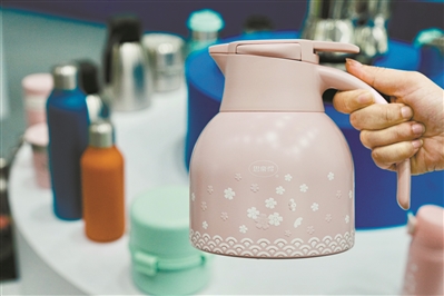 一些实用性的新设计也能吸引采购商的关注。“传统水壶在倒茶、咖啡时都会经过瓶塞内部,就可能有一些茶叶、咖啡渣残留在里面。”桂珺妤拿着一款保温水壶向记者介绍,“但这款水壶拥有实用新型专利的独特设计,水可以不经瓶塞内部就流出来,也就不会有残渣‘滞留’了。”