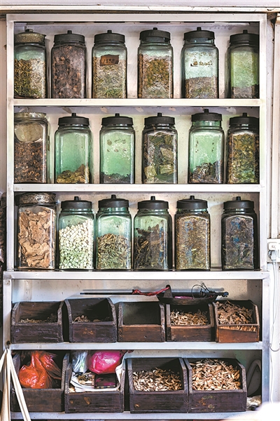 革新路,山草堂草药凉茶店铺内,药材琳琅满目