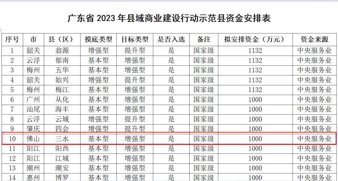 日前,由广东省商务厅、广东省财政厅组织开展的新一批县域商业建设行动示范县评选公布最终结果,佛山市三水区入选国家级县域商业建设行动示范县名单。按公告内容,入选县(区)拟获得1000万元的支持金额。