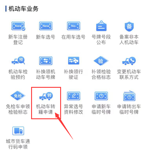 2、在【业务中心】页面,选择【机动车转籍申请】,进入机动车转籍申请业务流程。