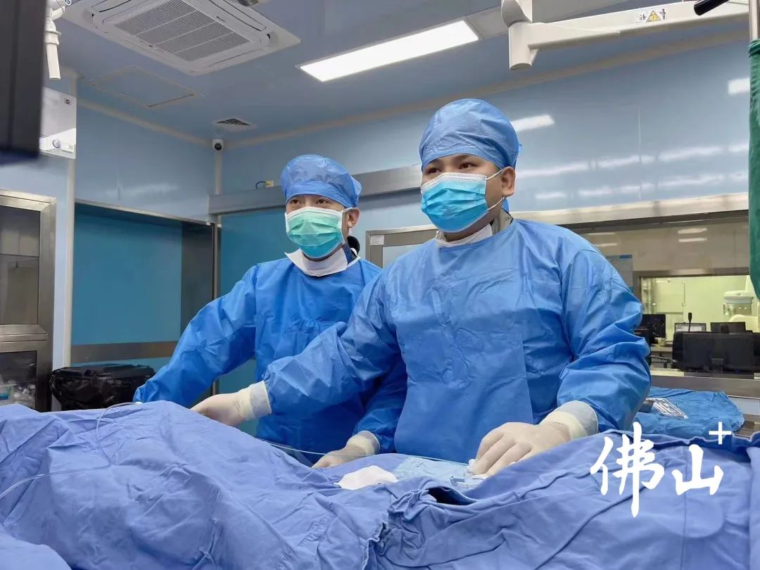 三水区人民医院神经外科主治医师廖伟强(右一)正在实施神经介入手术。