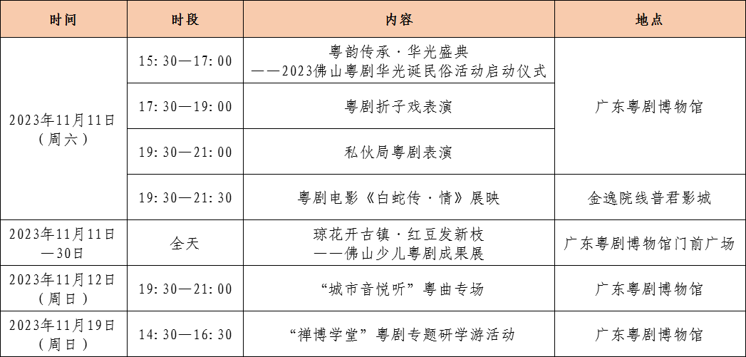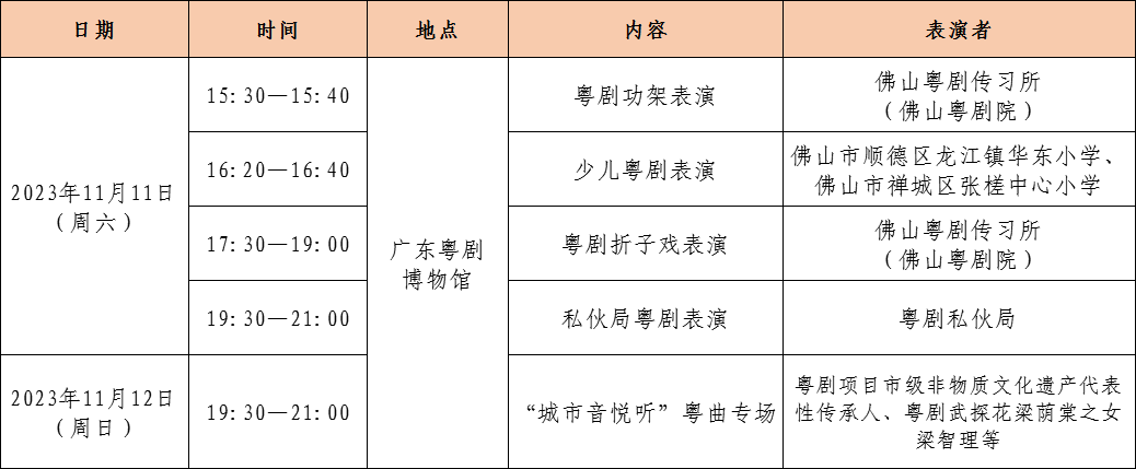 ①粤剧功架、折子戏表演:由佛山粤剧传习所(佛山粤剧院)带来集视觉、听觉于一体的专业粤剧功架表演、粤剧折子戏表演,演出节目有《粤韵悠扬》《红线盗盒》《猴王借扇》等。