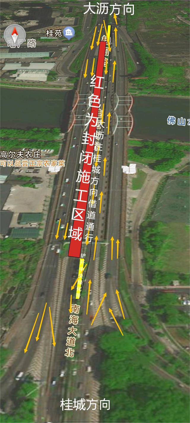 桂江大桥旧桥(桂城往和顺方向)占道施工期间,车辆分流路线如下(红色箭头为分流方向):