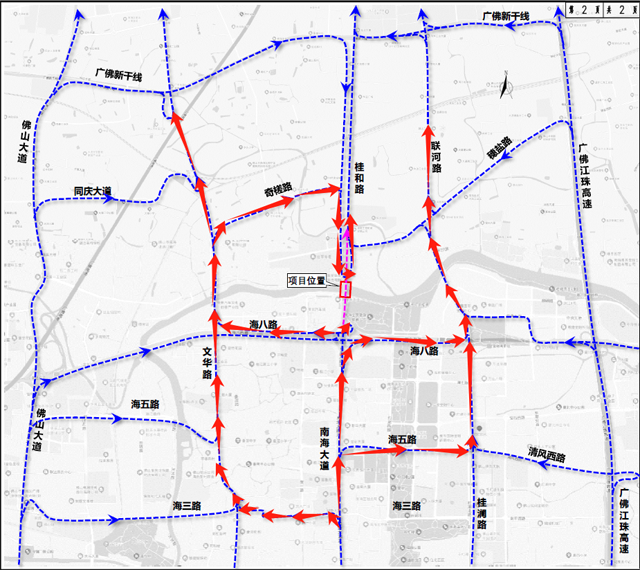 桂江大桥旧桥(和顺往桂城方向)占道施工期间,车辆分流路线如下:从和顺往桂城方向的车辆,车辆分流路线如下(红色箭头为分流方向):