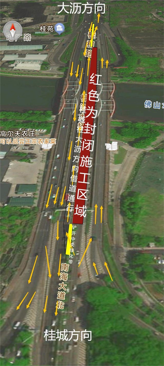 施工期间车辆通过两侧新桥并借道对向一个车道疏导交通,保证南北两个方向各有三车道通行。请途经桂江大桥施工区域的车辆提前规划出行路线,尽量绕行南海大道,海三路、海五路、文华路、桂澜路、联河路、穗盐路、广佛新干线等周边道路,并留意实时交通状况,按现场交通指引有序通行。