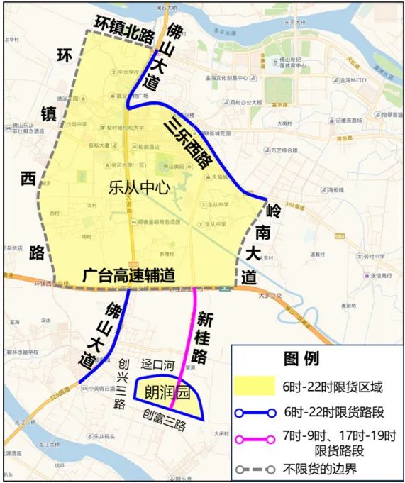(乐从镇中心片区及万科朗润园片区货车限行区域示意图)
