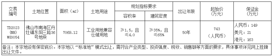 备注:本宗地设有保密底价。本宗地以“标准地”模式出让,需符合产业类型、投资强度、税收、销售额等方面的要求,具体事项详见网上挂牌出让文件。