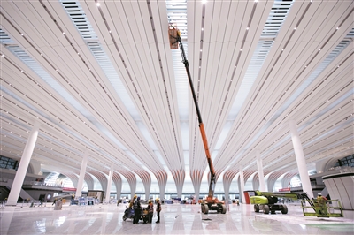 近日,记者在广州白云站现场看到,站房整体装修已大面积完工,现正进行边角料收尾工作。从外观看,站房整体金属屋面已全部完成,屋顶“云山珠水,盛世花开”的木棉花造型已全部“绽放”,室内则还有部分工人乘坐机械吊,给“花瓣”内侧贴上红色花纹。