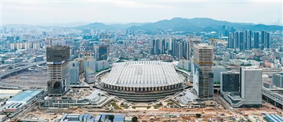 其中,“花瓣”钢结构为最大悬挑28米、总重量8250吨的花瓣状格构式变径斜柱,屋面东西各有12榀飘带花瓣、15榀内花瓣和25榀外花瓣,一共104榀花瓣,构成木棉花造型。屋盖钢结构重8100吨,总面积95224平方米,面积相当于13个标准足球场大小。