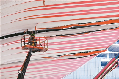 工人为白云站“木棉花瓣”上色。
